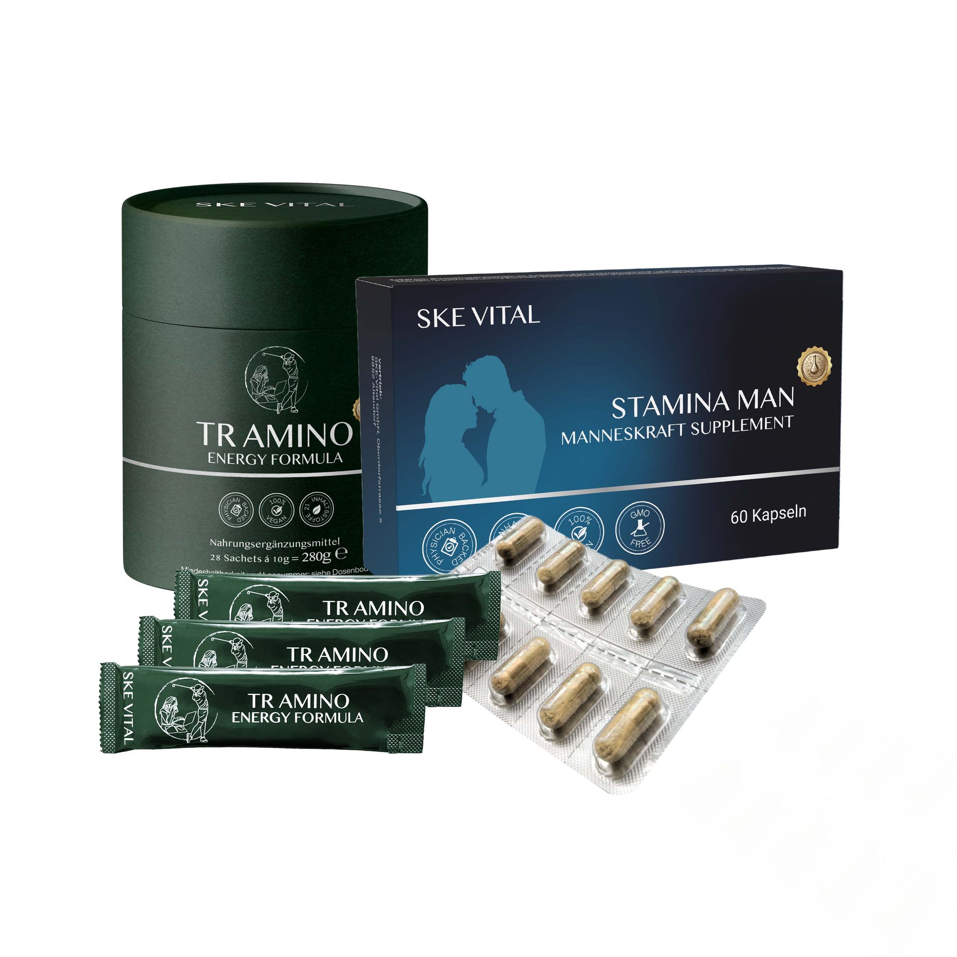 Energie, Vitalität, Ausdauer und Leistungsfähigkeit: Dazu braucht es eine gesunde Ernährung, die wohlabgestimmte Zufuhr der richtigen Nährstoffe und regelmässige Bewegung. zur Förderung der männlichen Vitalität in jeden Bereich. 60 Kaps. Stamina Man und 28 Stick TR-Amino
