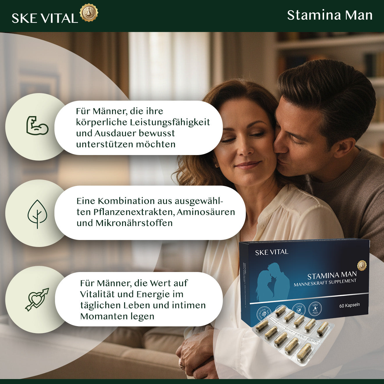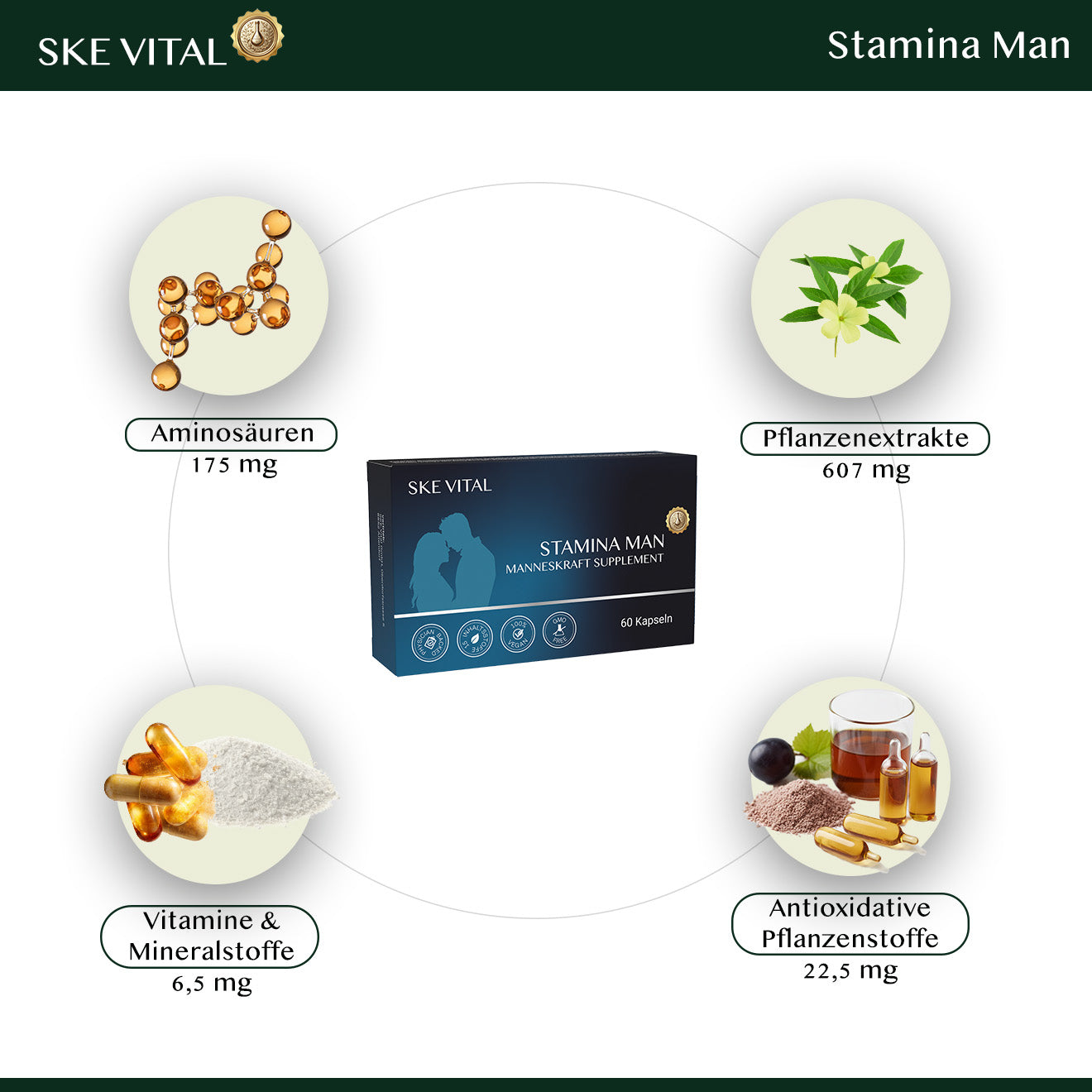 - A modern formula designed to support male energy, endurance and confidence.Stamina Man combines carefully selected plant extracts, amino acids and micronutrients traditionally used to support male vitality, circulation and overall wellbeing.Developed with a science based approach to support men who want to feel strong, focused and energised.Daily support for stamina, performance and vitality.